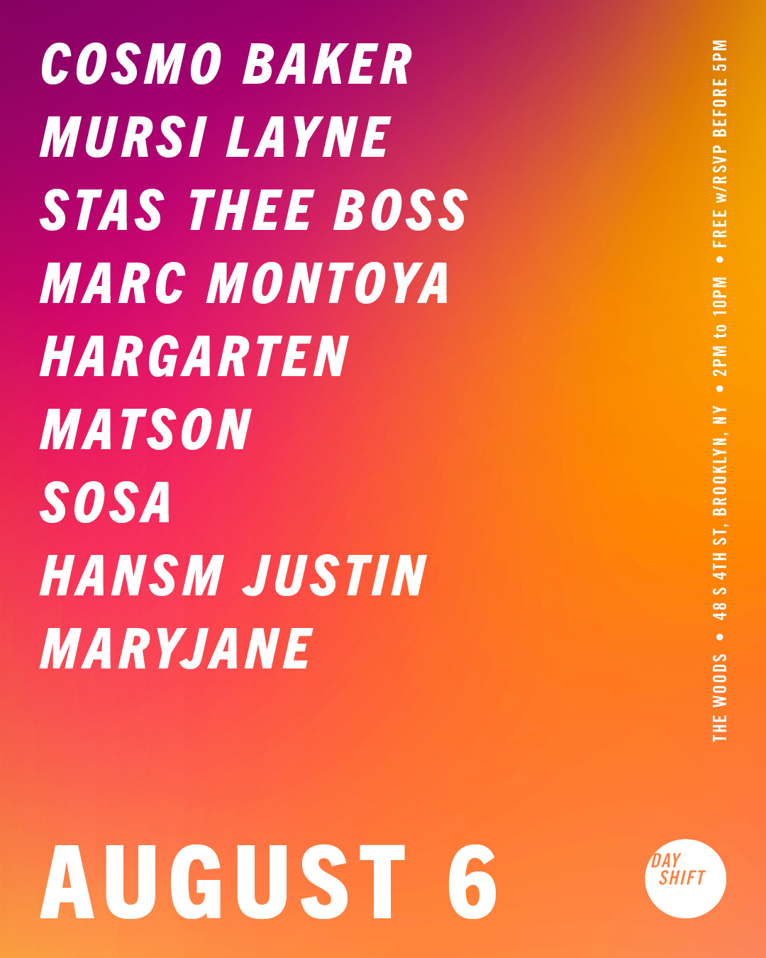 Sunday, August 6, 2017 Day Shift Dance. Day drink. Until the sun comes down! Day Shift, the daytime dance party from the West Coast, comes to Brooklyn for a full day of sunshine, music, and friends from all five boroughs! Let’s vibe.